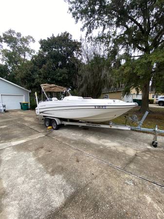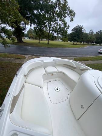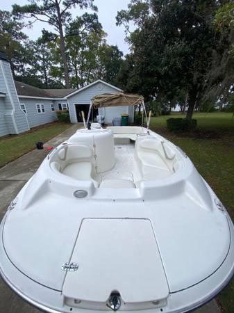 21' 2002 Glastron Deckboat DX210. Newly recovered seats. Updated with 2 batteries and switch. I have the Helm Windscreen. Comes with Life Jackets and all required safety equipment. Tube, ski rope, deck lines, bumpers, and 2 anchors. Great family boat. Rated for 13. Comfortable with 6-8 and will still cruise at 25-30 without issue. Starts up first time. Newer stainless prop. All electrics work except Garmin. I think it's a power issue behind the console. Great boat, great reliable motor, great trailer. Perfect for family tube day on the water or load the cooler and head to the sandbar.