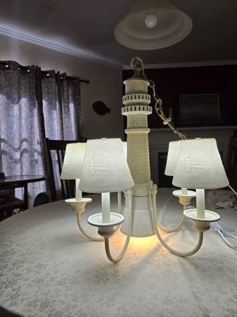 Lighthouse chandelier beige in color, porcelain shades, 3 lighting configurations, bulbs included, great for beach houses