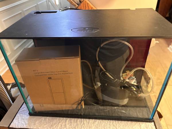 5 gallon glass aquarium complete setup. Filter, lighted cover, air pump, 15 new filters and siphon cleaner. NO leaks or damages. Sanitized