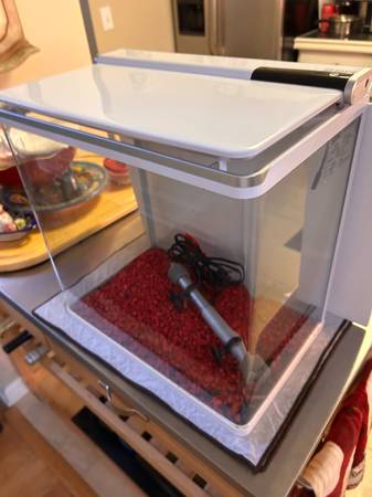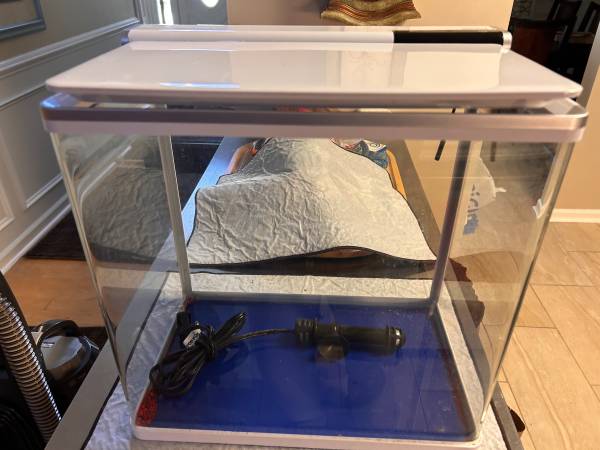 8 Gallon acrylic aquarium with heater. Built in cover. Can be used for fish or reptiles NO damages or leaks. Sanitized.