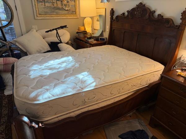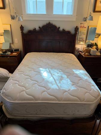 Very nice firm thick mattress and matching box spring. No stains or damage. Just too firm for me. Custom made for antique bed so a few inches narrower than queen and a few inches longer with rounded...