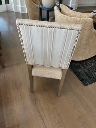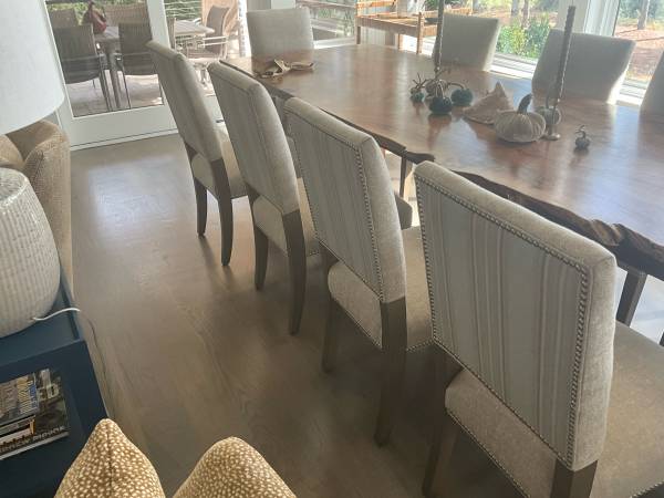 Arhaus Torino Dining Chairs (10 Each) with custom fabric. These chairs are currently on sale at the Arhaus website for $870 each or $8700 plus tax and shipping in standard fabric choices. Like new condition in a timeless style.