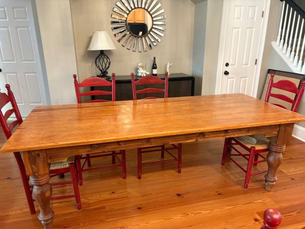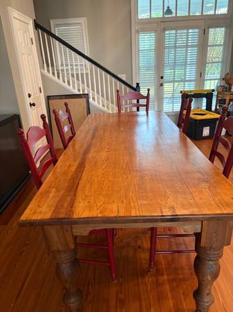 This is an awesome large pine table with 1 1/2” thick top with bulbous legs. 8 feet by 40”s. This is a very high quality table not an antique but made under same conditions with wooden dowels