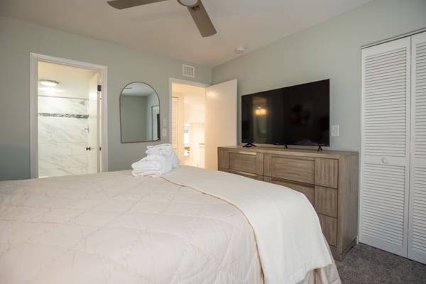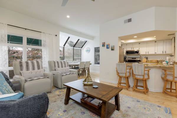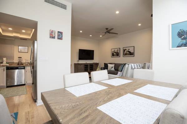 Step into a haven of coastal elegance as you enter this thoughtfully designed villa. Bathed in natural light, the open-concept living area features comfortable furnishings and a large flat-screen TV, creating an inviting space to unwind after a day of exploration.